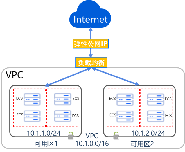 基础负载均衡通过绑定弹性公网EIP访问公网,基础负载均衡实例的后端服务器组可以关联多个云服务器ECS或者自建容器,负载均衡实例属于专有网络VPC内的云资源。