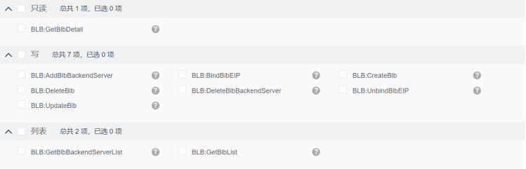 CecloudBLBOperationAccess | 默认使用基础负载均衡(BLB)的权限。策略权限脚本配置内容如下: { "Version" : "1", "Statement" : [ { "Effect" : "Allow", "Resource" : "*", "Action" : [ "BLB:Get*", "BLB:UpdateBlb", "BLB:BindBlbEIP", "BLB:UnbindBlbEIP", "BLB:AddBlbBackendServer", "BLB:DeleteBlbBackendServer", "EIP:ModifyBandwidth", "EIP:BindEIP", "EIP:UnbindEIP", "EIP:Get*" ] } ] } |
