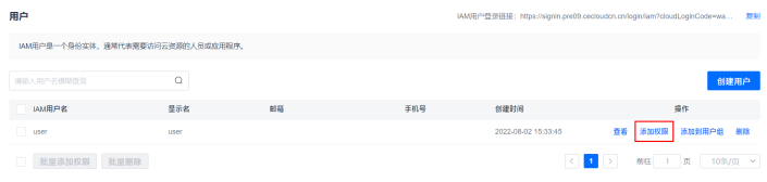 (2) 单击IAM用户对应操作列的“添加权限”,弹出添加权限窗口。