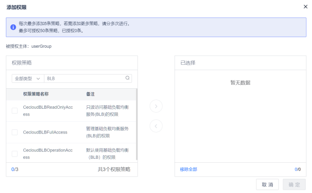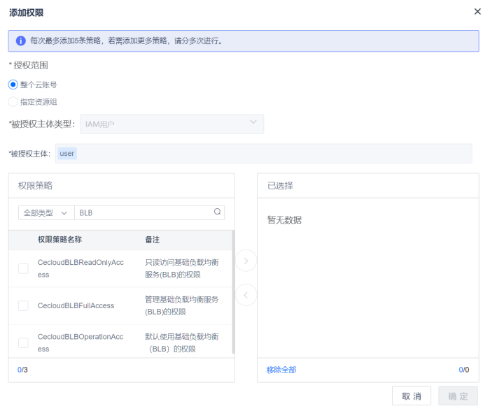 (5) 在权限策略区域,选择一个或多个BLB权限策略后,单击