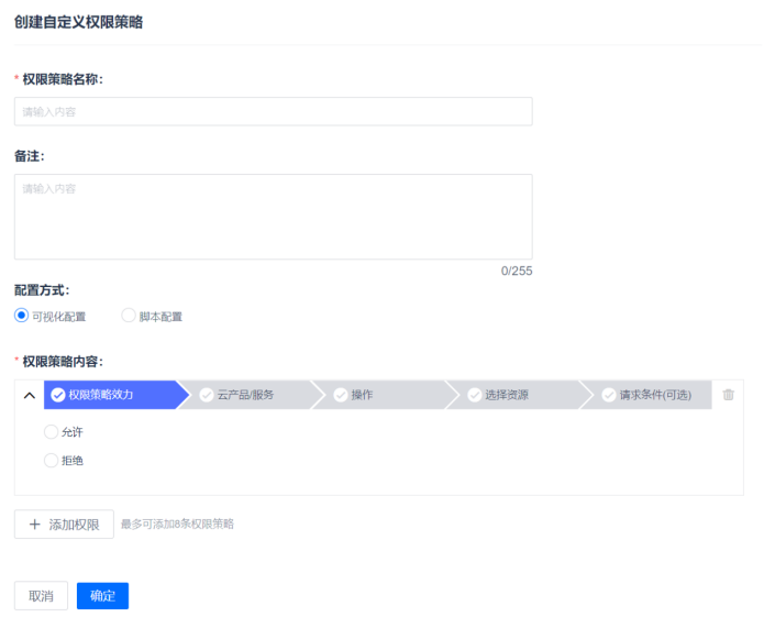 自定义策略是由系统开放资源授权项(Action),支持自主创建、更新和删除策略。目前支持“可视化配置”和“脚本配置”两种方式创建自定义权限策略: