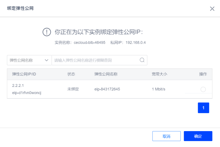 (3) 单击基础负载均衡实例对应操作列的“绑定公网IP”,弹出绑定弹性公网窗口。
