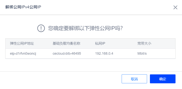 (3) 单击基础负载均衡实例对应操作列的“解绑公网IP”,弹出确认窗口。