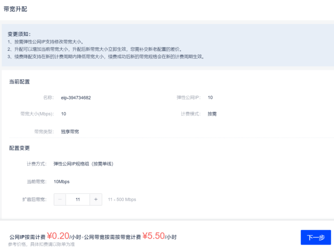 (4) 根据需要,配置扩容后的带宽大小后,单击“下一步”,进入确认配置页面。